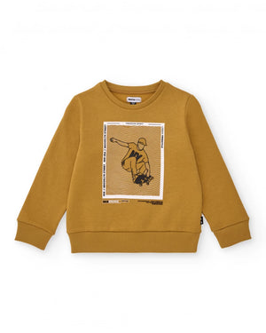 elpa da bambino in colore senape dallo stile urbano. Presenta una stampa frontale con skater in movimento e linee ondulate che creano un effetto visivo originale. Girocollo, maniche lunghe e bordi a costine su polsini e orlo per una vestibilità comoda. Perfetta per un look casual e alla moda.